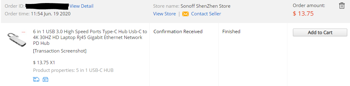 위에 가격이 나와있듯 13.75달러를 결제하고 받은 제품인데, 당시 국내 쇼핑몰에서 판매하는 USB C 허브 제품들은 가격이 꽤 부담되는 수준이었던 걸로 기억한다.