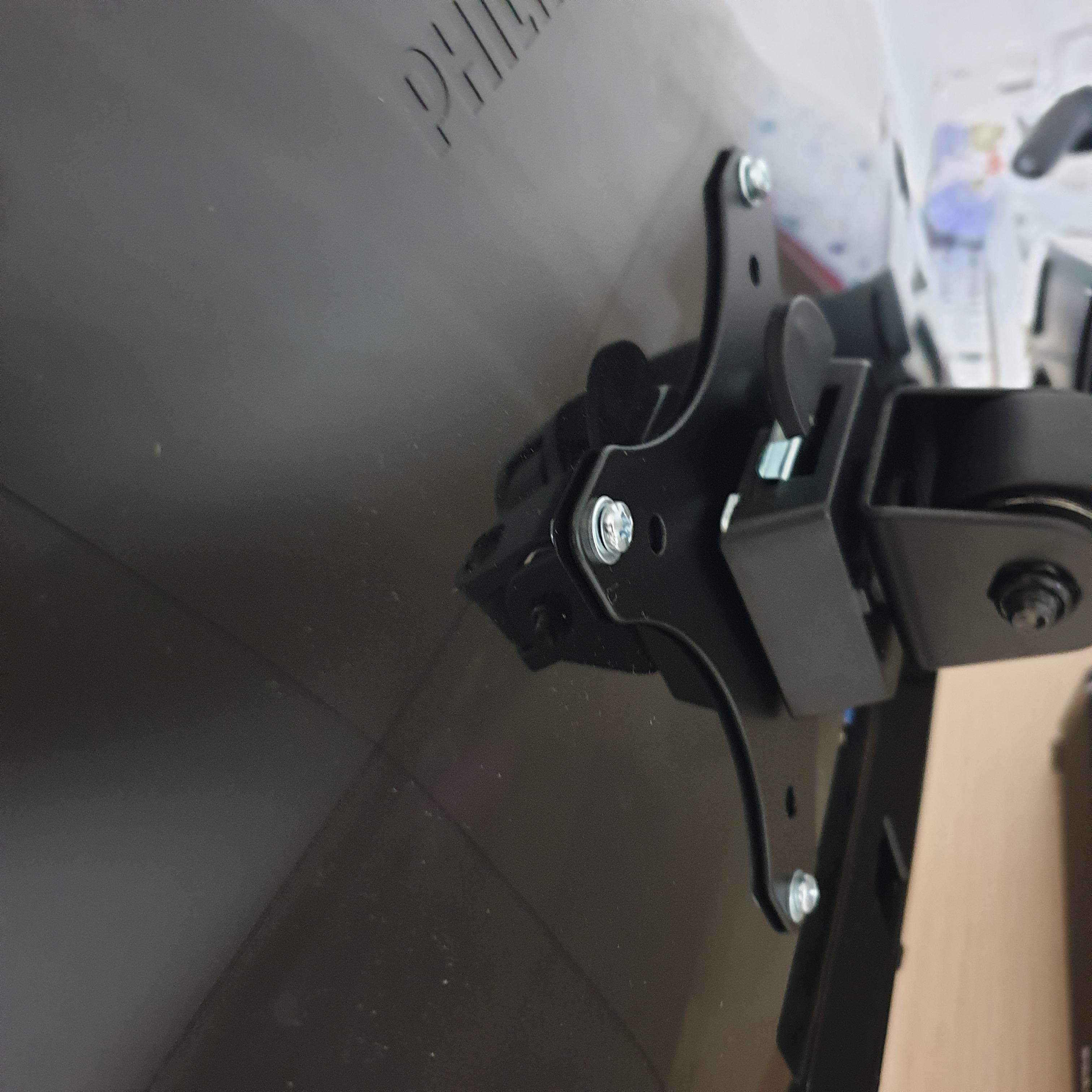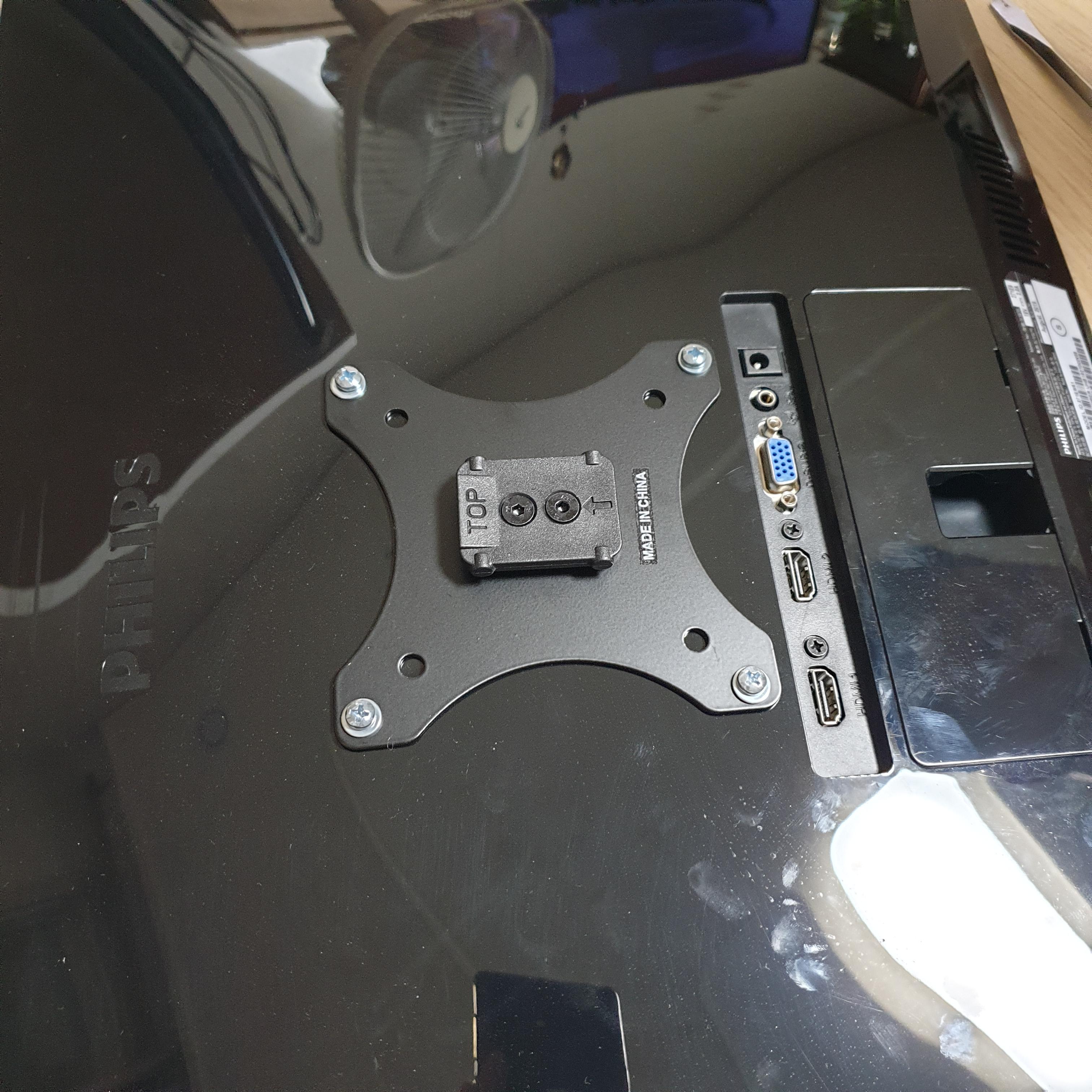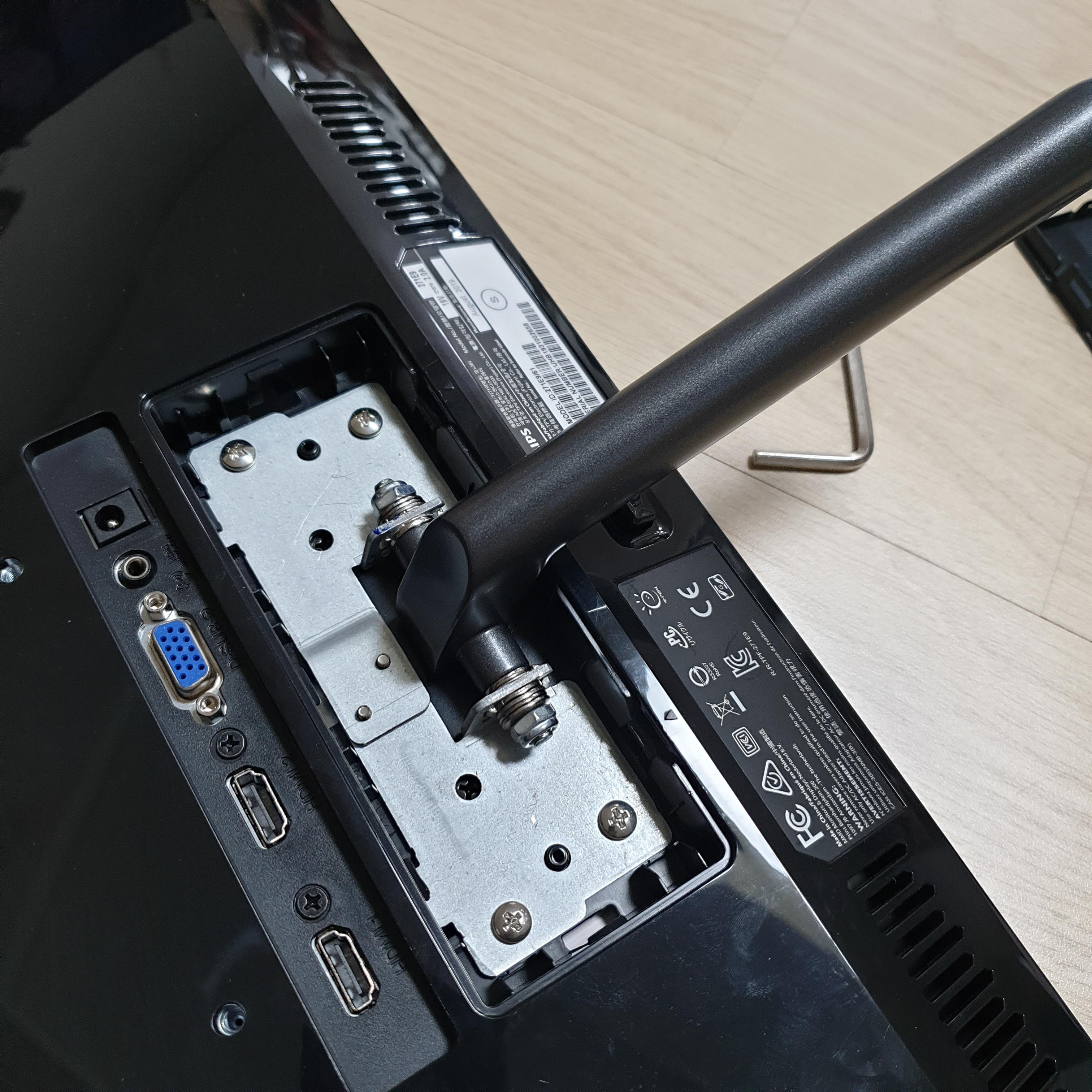 어쨌든 잘 떼줬다면 이제 모니터암용 브라켓을 모니터 뒤통수 베사홀에 고정해주자.