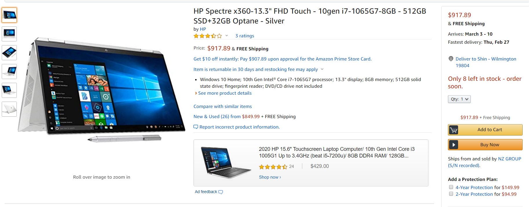 어쨌든 2020년 신형 모델의 스펙터이고, cpu는 10세대 i7에 ssd 512GB 모델이 세금 제외 917.89 달러이다. 램이 8GB인건 아쉽지만 패스하고..