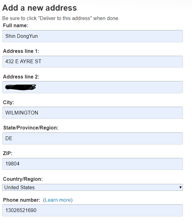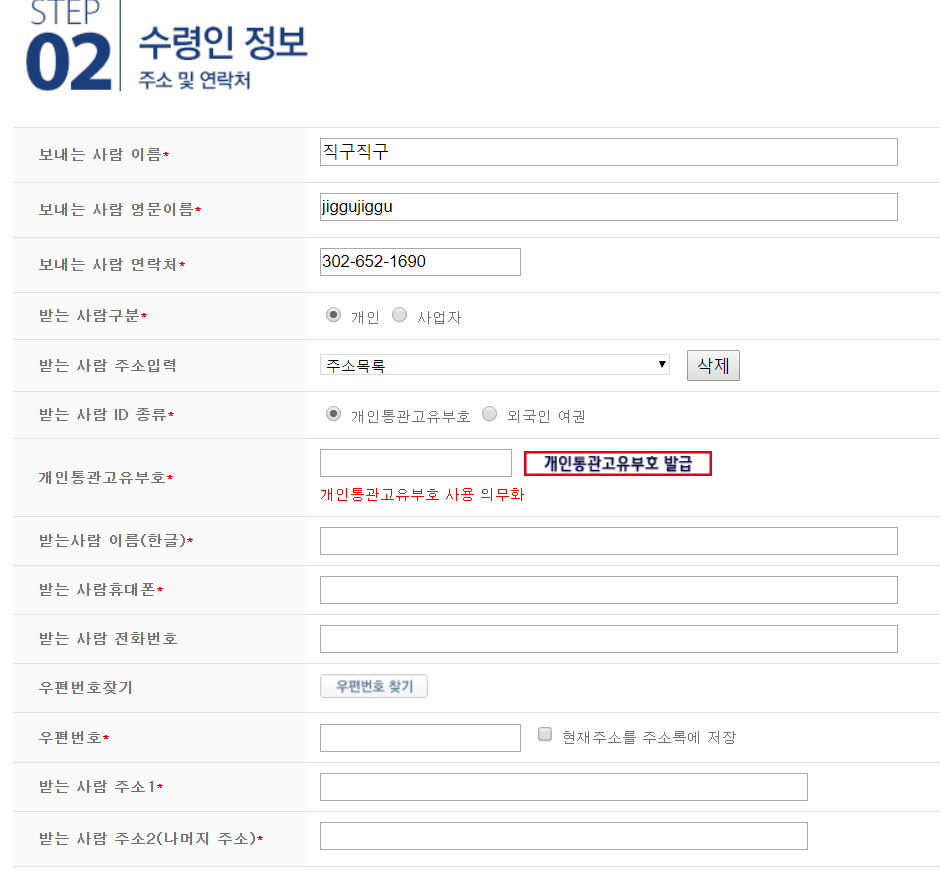 다음으로 배대지를 통해 한국에서 배달받을 주소, 연락처 등 개인정보를 입력해주면 된다