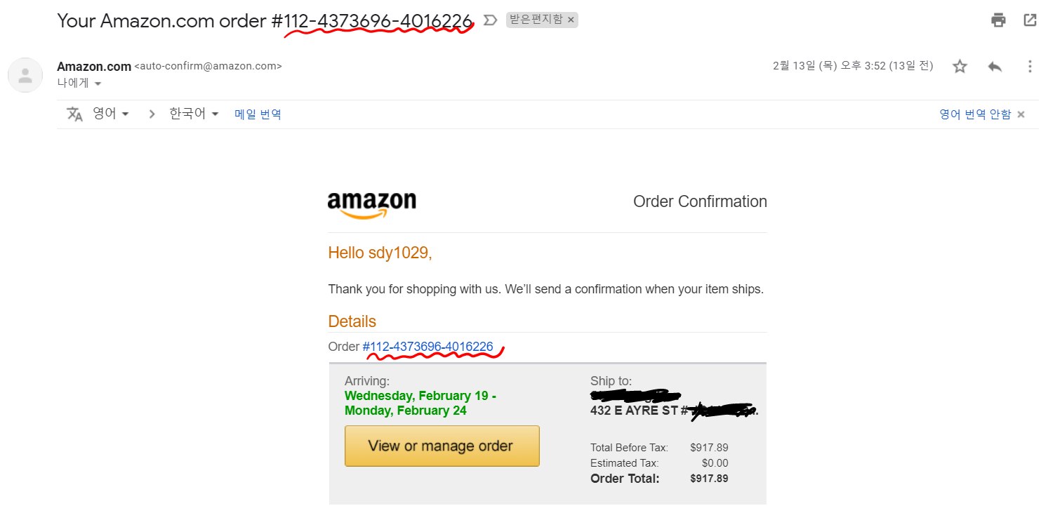 상품 오더번호와 트래킹번호가 중요한데, 상품 오더번호는 아마존에서 주문이 들어간 즉시 메일 및 마이페이지에서 확인할 수 있다