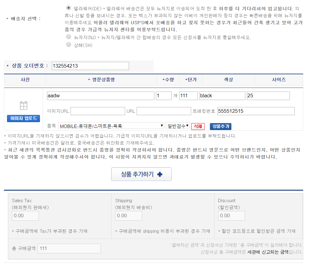 배송대행 사이트 측에서도 제품에 대한 정보를 알아야 배대지에 도착한 물건이 내가 주문한 것이 맞고, 어디로 보내야 하는지를 알 수 있도록 하는 과정이다.