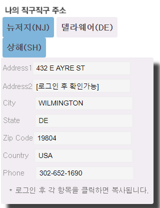 이러한 부분이 보일 것이다. 이는 각 나라에 위치한 배송대행지의 주소로, 사이트에 회원가입을 하고 로그인 하면 Address2 항목이 보이며 아마존에서 물건을 주문할 때 완전한 주소를 받아 입력할 수 있다