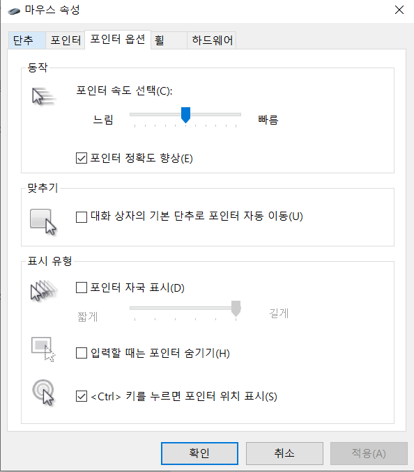 그럼 이렇게 마우스 속성 창이 뜨는데, 위에서 세 번쨰 포인터 옵션을 선택하면