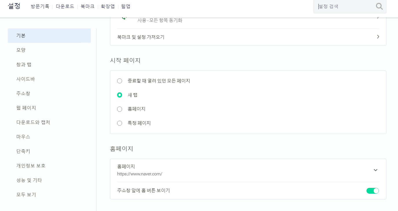 설정 창에서 시작 페이지를 확인해보면, '새 탭'으로 설정되어있는 것을 볼 수 있다