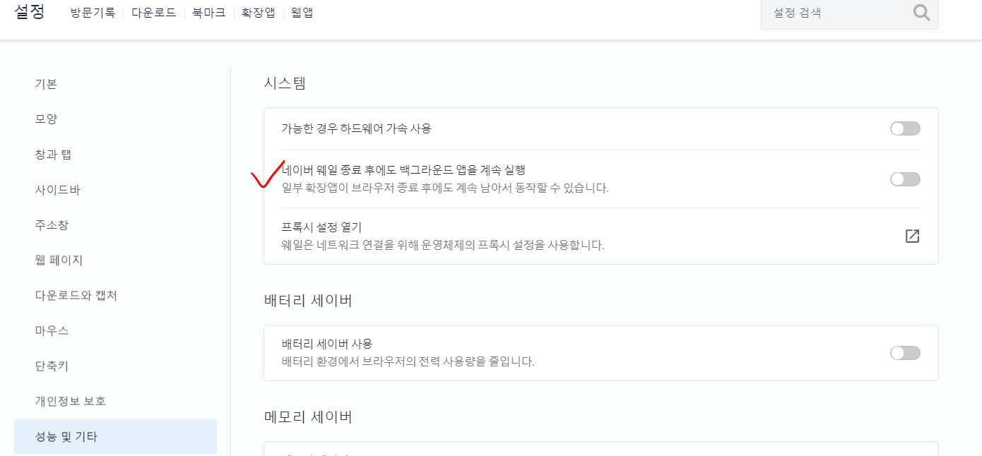 간단히 '백그라운드에서 웨일(크롬) 실행' 옵션을 꺼주면 된다
