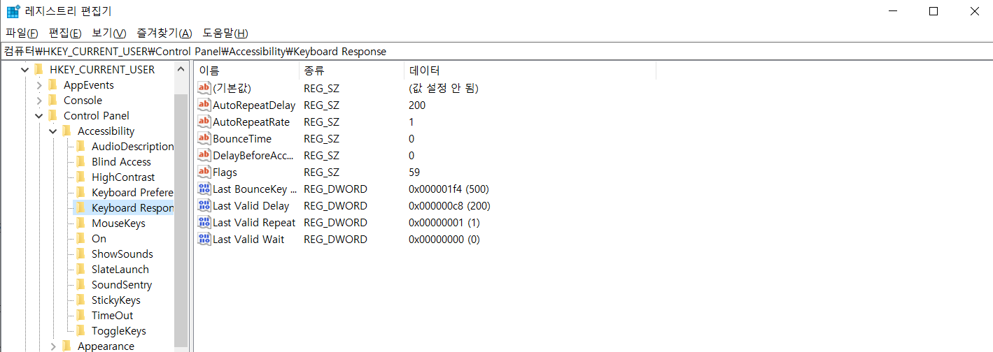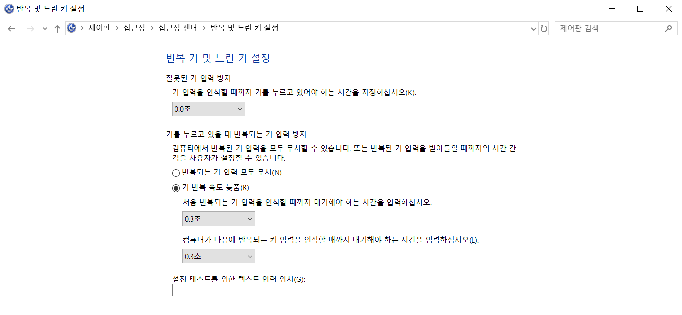 키 반복 속도 늦춤 = 꾹 누르기 시작한 뒤 몇초 간격으로 입력으로 인식할 것인지 설정. 최소값이 0.3초임
