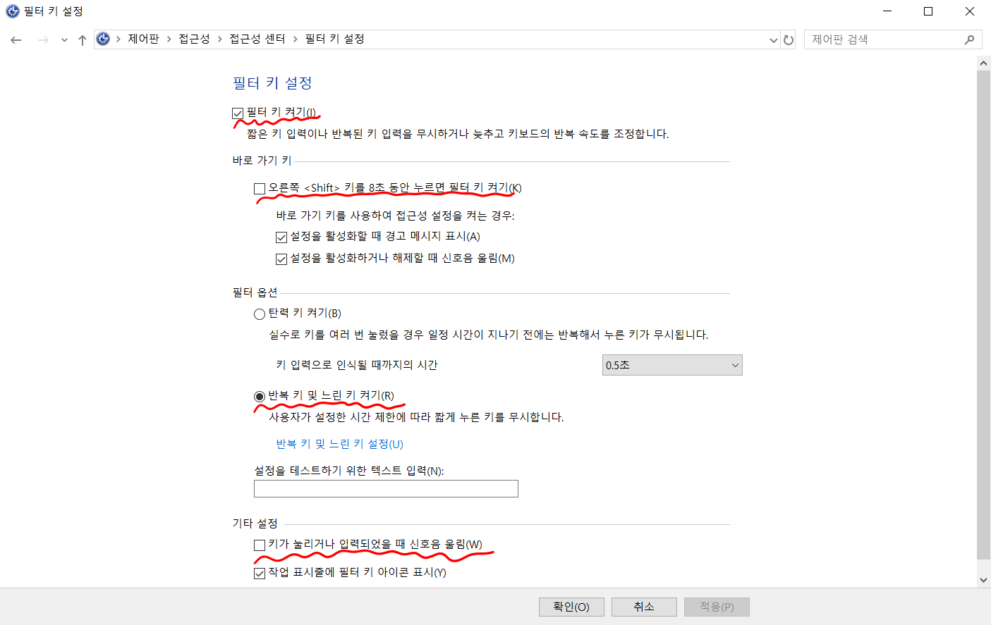 잘못된 키 입력 방지 = 키보드를 누른 뒤 얼마 후부터 입력으로 인식할 것인지 설정. 당연히 0초로 해야함