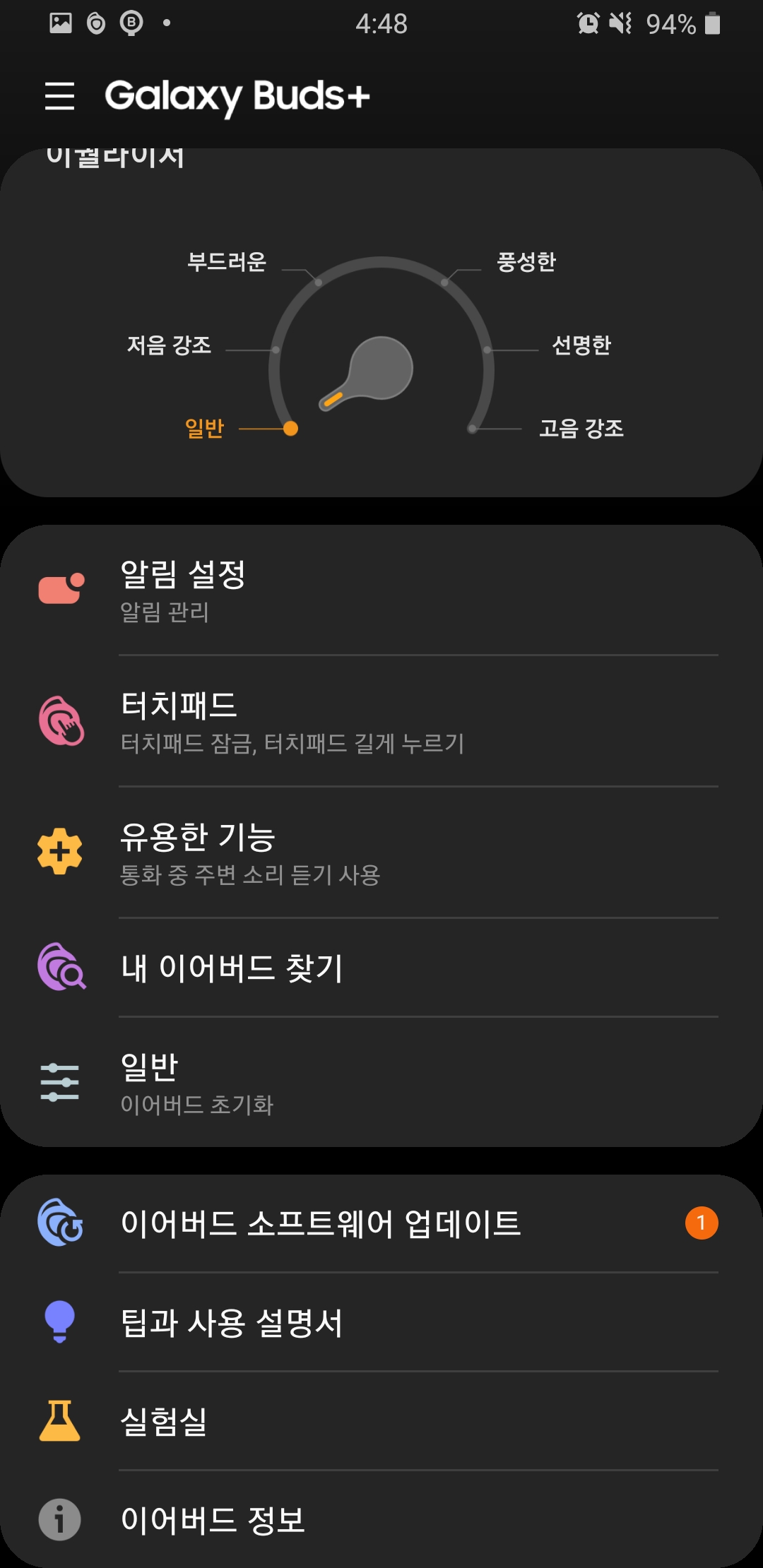 어플 내에서 이퀄라이저 조절, 터치패드 조작 등 여러가지 버즈 플러스에 대한 설정을 간편히 할 수 있다.
