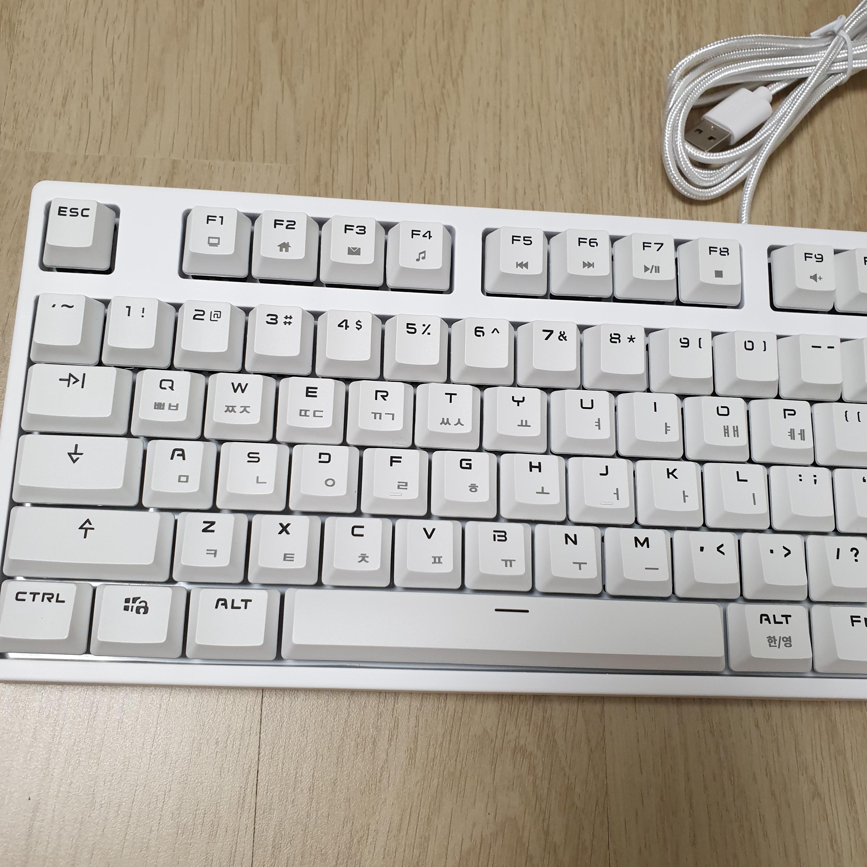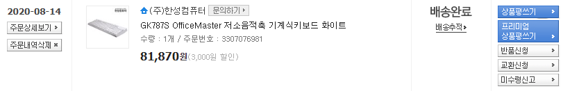 어쨌든 그래서 흰색이면 훨씬 낫겠다~ 싶어 이왕 사는거 타자 소리도 조용한 저소음 적축 중 가격이 적당한 제품을 찾아보았고, 내 목적에 가장 부합하는 제품인 한성의 GK787S, 오피스 마스터를 구매하게 되었다.