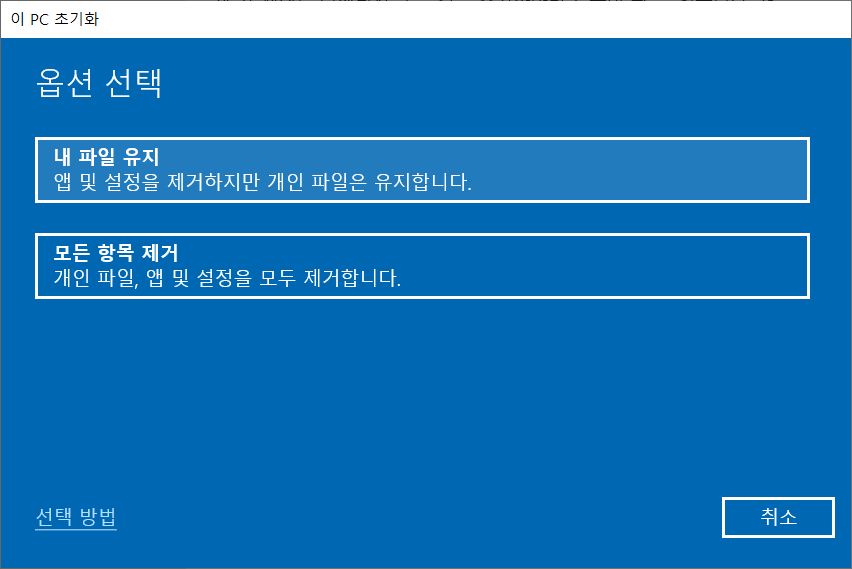원래라면 이런 식으로 윈도우 재설치를 진행하면 되는데, 여기서 문제가 되는 점은 맨 왼쪽 사진에 나타난 '옵션 선택'에서, 두 옵션을 살펴보면 알 수 있다.