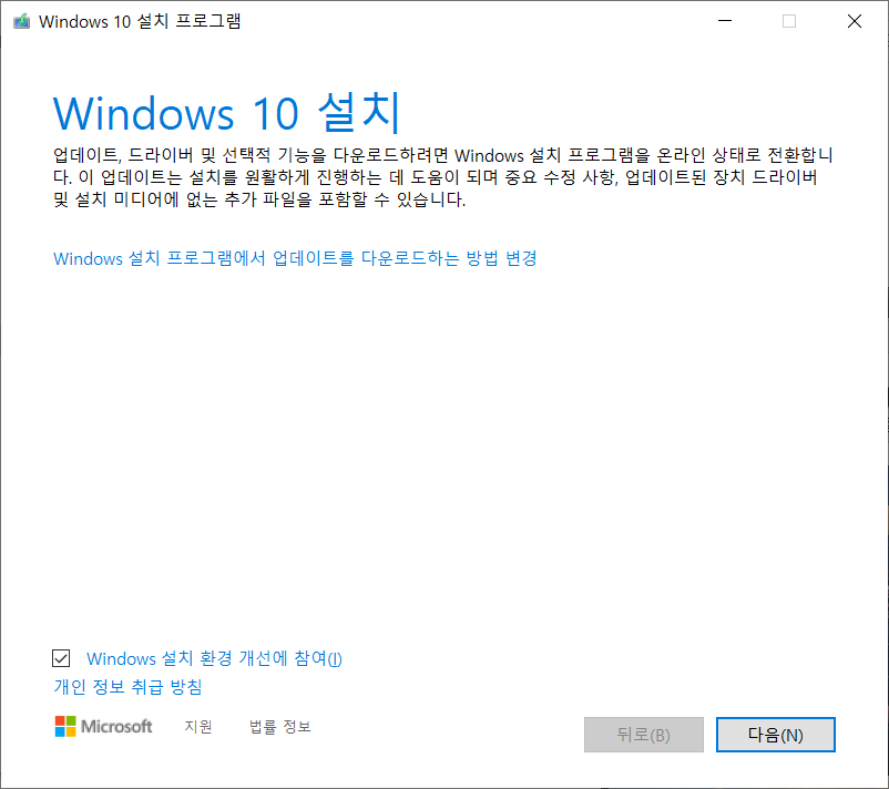그럼 이렇게 윈도우10 설치를 진행할 수 있는 창이 켜진다.