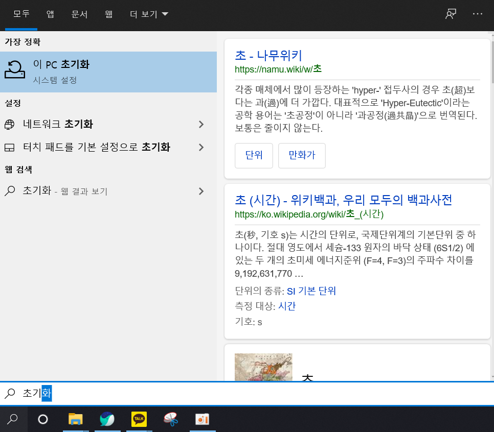 윈도우 검색창에 '초기화'를 검색하면, 바로 이 PC 초기화 옵션이 검색된다.