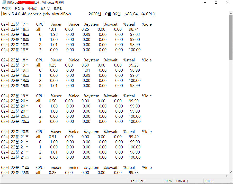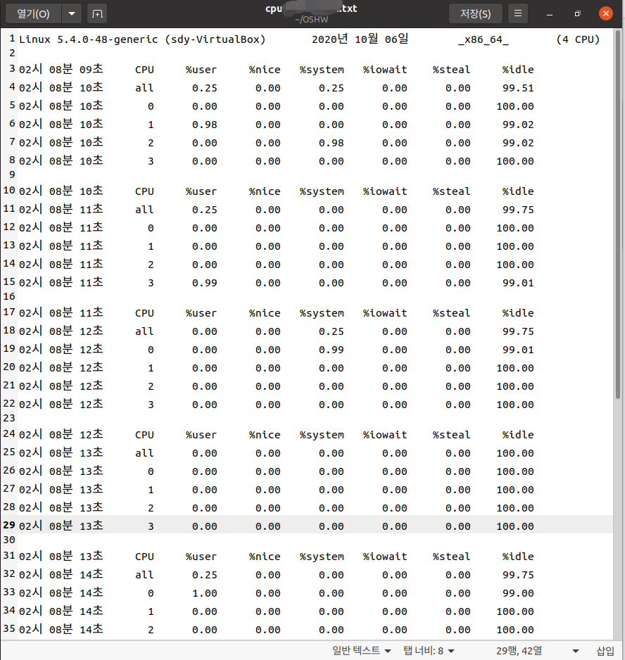 이 파일 기준 2열의 OO초 정보와 all행 9열의 %idle 값을 뽑아낼 것이다.