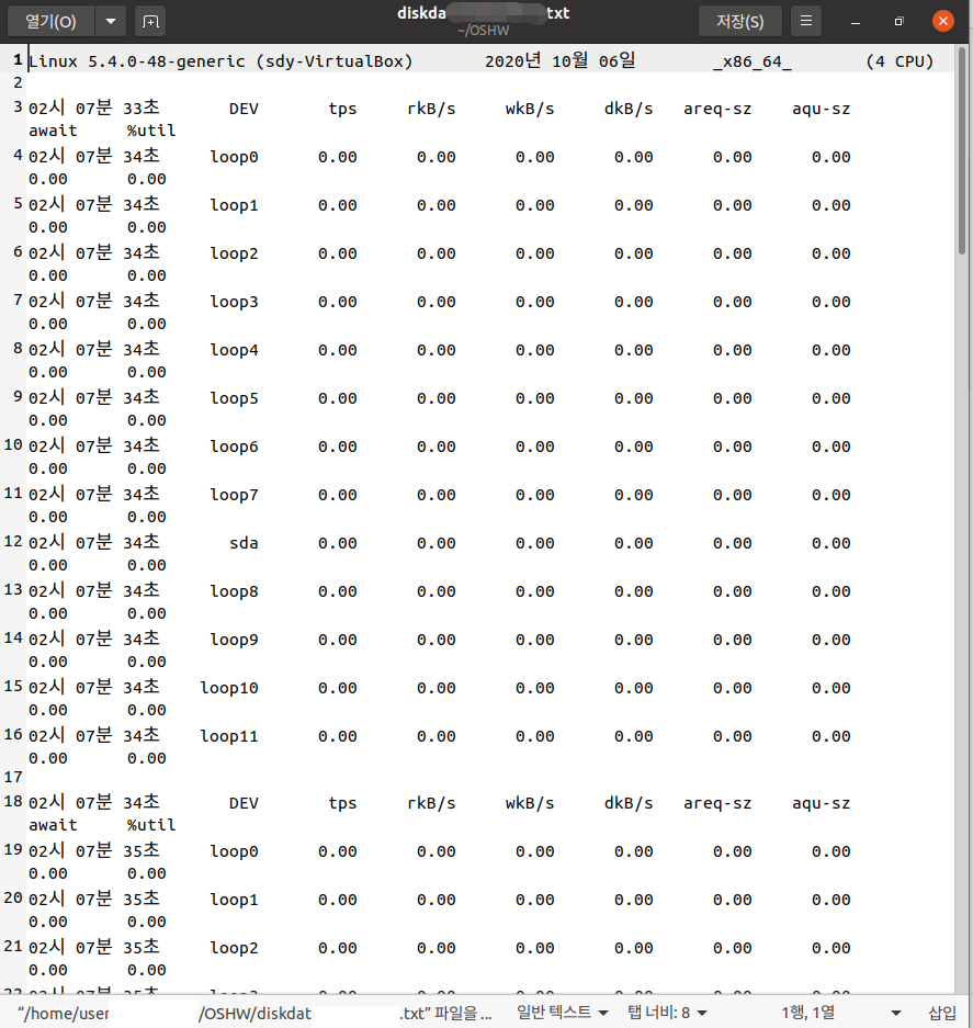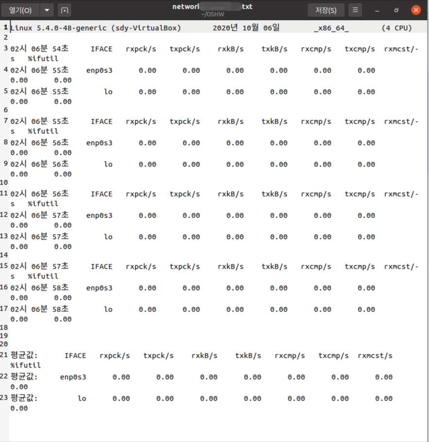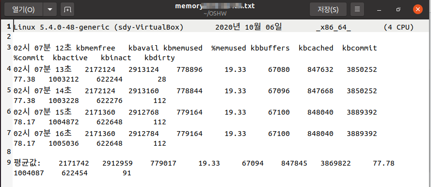 [['Linux', '5.4.0-48-generic', '(sdy-VirtualBox)', '2020년', '10월' '06일' '_x86_64_', '(4' CPU)' ], #1행