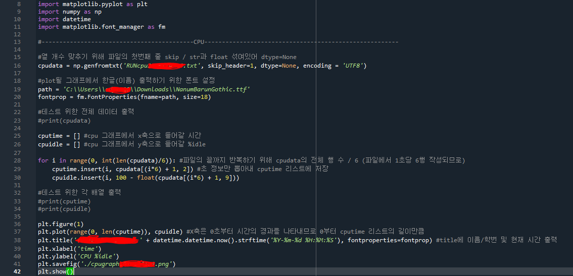 'RUNcpu학번.txt' : 읽을 파일 이름이다. 파일 위치는 해당 파이썬 파일이 저장된 디렉토리에 저장해 두었다. 다른 곳에 파일이 있으면 파일 주소를 전부 입력해주면 된다.