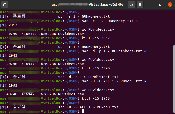 그 후 wc 명령어를 실행하여 결과가 출력되는 것을 확인한 뒤, kill 명령어를 이용해 방금 출력된 id의 프로세스를 강제 종료시킨다.