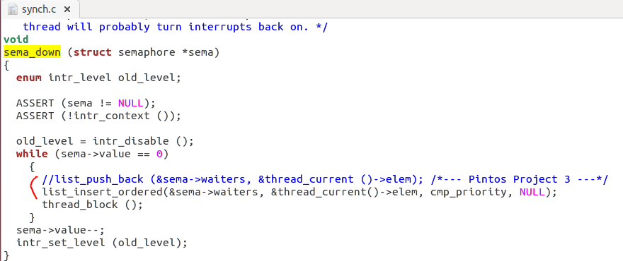기존 리스트 삽입 방식에서 방금 작성한cmp_sem_priority를 사용해 우선순위에 따라 정렬되어 waiters에 삽입되도록 수정하였다.
