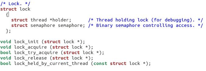 기존 Pintos에서 사용되는 Semaphore 구조를 확인했다. 안내자료와 동일하게 코드가 적혀있는 것을 확인하였다. value가 현재 남은 자리를 나타내는 것으로, 각 thread가 semaphore를 획득할 때 value가 1 줄어들고, 반환할 때 value가 1 늘어난다.